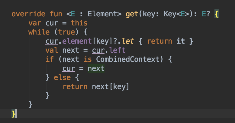 이 때 Element가 있을 경우 바로 반환하고 아닐 경우는 left에 있는 CoroutineContext를 반환하는 처리를 합니다.